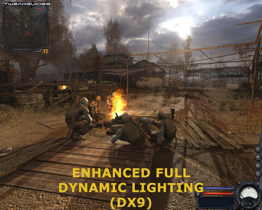Render: This setting determines the renderer used for generating the game's graphics, and hence has a major impact on the overall visual quality and performance in the game. The options include (from lowest to highest): Static Lighting, Objects Dynamic Lighting, Full Dynamic Lighting, Enhanced Full Dynamic Lighting, Enhanced Full Dynamic Lighting (DX10). Note that the first three modes were available in the original STALKER, but the two 'Enhanced Full Dynamic Lighting' modes are new to Clear Sky, and the DX10 render mode in particular is only available in Vista when using DX10 hardware. Screenshot comparisons of all five are provided above, and each is explained in detail further below: